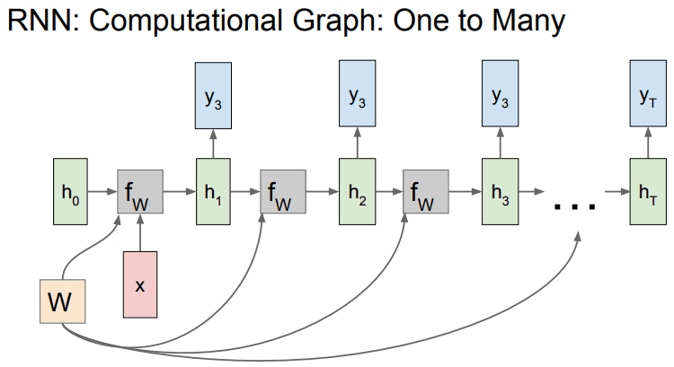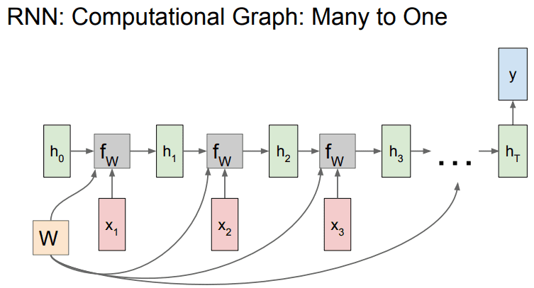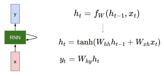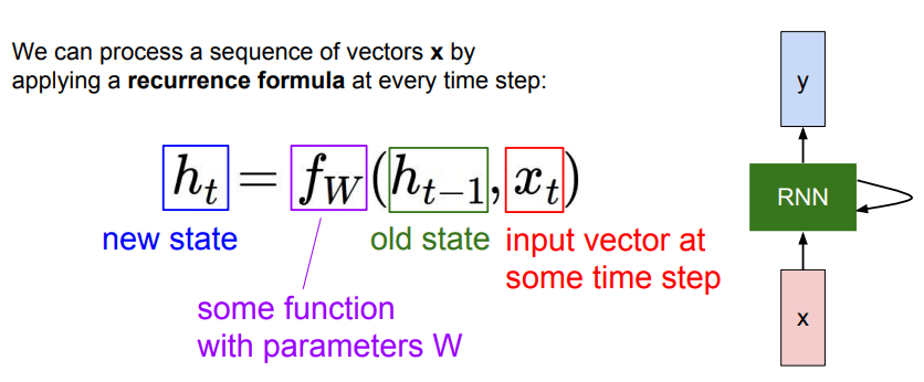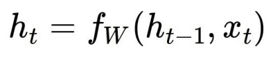 - h_t : 현재 시점의 hidden state 이때, 함수 f와 파라미터 W는 모든 시점에서 동일하다.