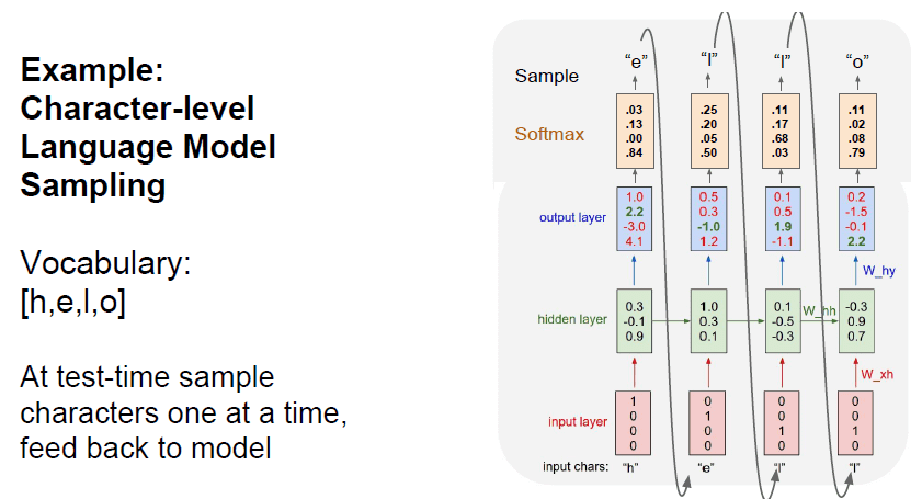 - 흥미로운 점 : 마지막 시퀀스에서 “l”의 확률이 가장 높은데 “o”가 출력되었다. 👉 출력부에서 softmax로 확률을 도출하고 이들 중 가장 큰 값을 출력하는 것이 아닌 sampling을 통하여 값을 선택하기 때문이다. 👉 모델의 다양성을 높여 적절한 output을 얻게한다.
