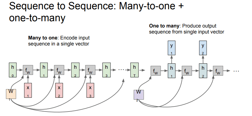 - Many to one : Encoder, 가변입력을 받아 하나의 벡터로 요약한다.