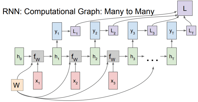 h_1, 입력 x_2 ⇒ h_2 = f_W(h_1, x_2) ⇒ y_2, L_2