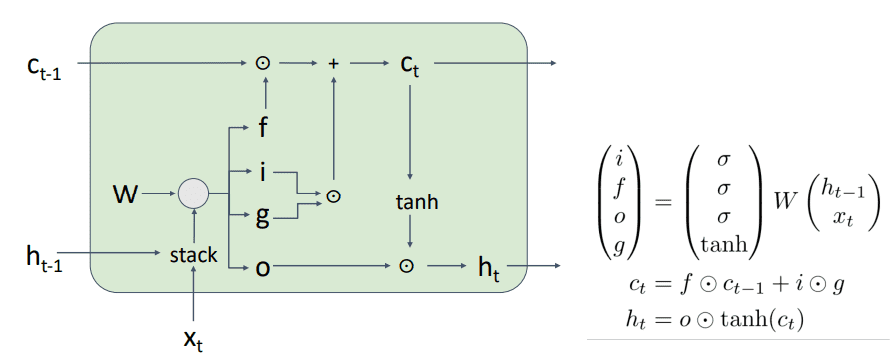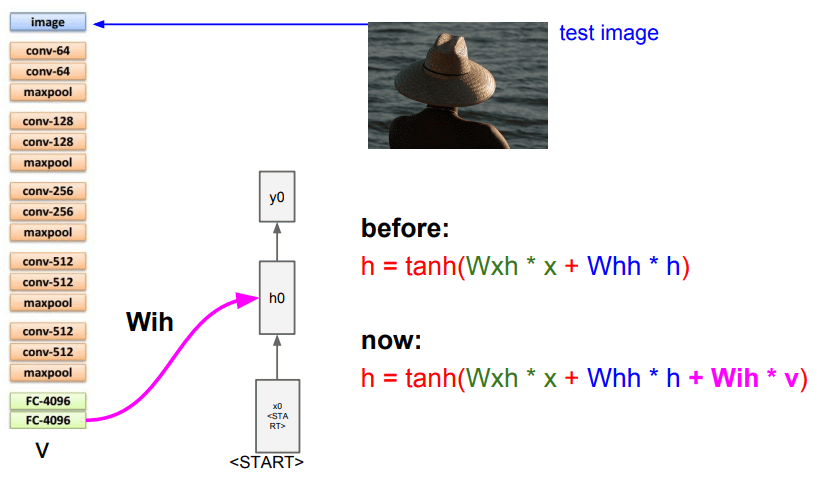 - 기존 Vanilla RNN 식에서 CNN의 출력 벡터에 새로운 가중치(W_ih)를 곱하여 더한다.