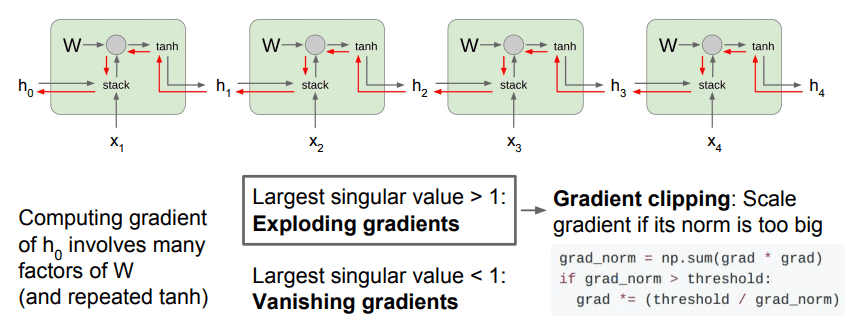 - 이 경우, 곱해지는 값이 1보다 크거나 1보다 작을 경우 각각 exploding과 vanishing의 문제가 발생하게 된다. exploding은 gradient clipping(gradient 의 L2 norm 이 기준값을 초과할 경우 threshold/L2 norm 을 곱하여 정규화)을 통하여 제어가 가능하나, vanishing은 결국 gradient vanishing을 야기한다.
