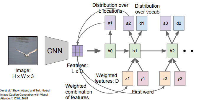 - h0이 이미지의 위치에 대한 분포(a1)를 계산하고, 이 분포를 다시 벡터집합(LXD)와 연산하여 이미지 attention (z1)을 생성한다.