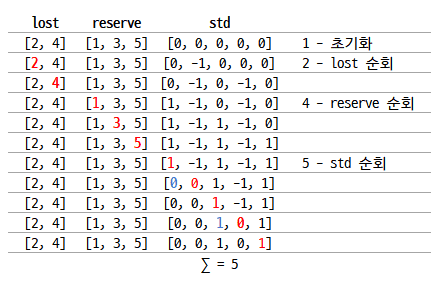 - lost를 순회하며 체육복을 도난 당한 학생의 std 값에 1을 빼준다.